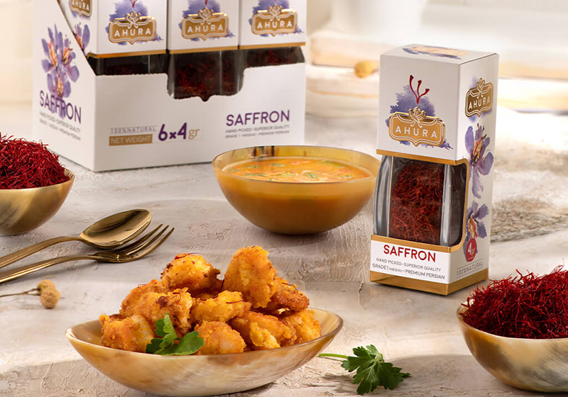 بستهبندی های پاکتی زعفران برند اهورا با استفاده از دو رنگ طلایی و بنفش که هر دو ارجاعی مفهومی به ماهیت زعفران دارند ، در ۲ وزن متفاوت طراحی و اجرا شدهاند. طراحی ساده و در عین حال زیبای این بستهبندی ها باعث جذب هر چه بیشتر جامعه هدف این برند در کشور انگلستان شده است.