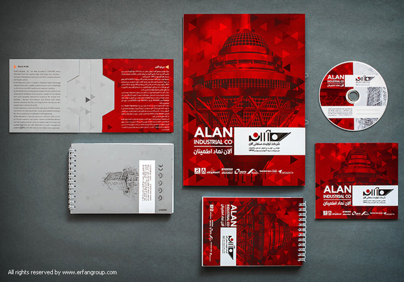 چاپ و طراحی هویت سازمانی شرکت صنعتی آلان که در حوزه ی مهندسی سازه و نما فعالیت می کند، برعهده ی شرکت تبلیغاتی طراحان عرفان بوده است. گروه طراحان عرفان علاوه بر طراحی کاتالوگ، طراحی دفتر یادداشت مهندسی، طراحی فولدر، طراحی پاکت سی دی، طراحی ساک دستی و دیگر ملزومات شرکت صنعتی آلان را برای حضور در نمایشگاه، طراحی و چاپ کرده است.
