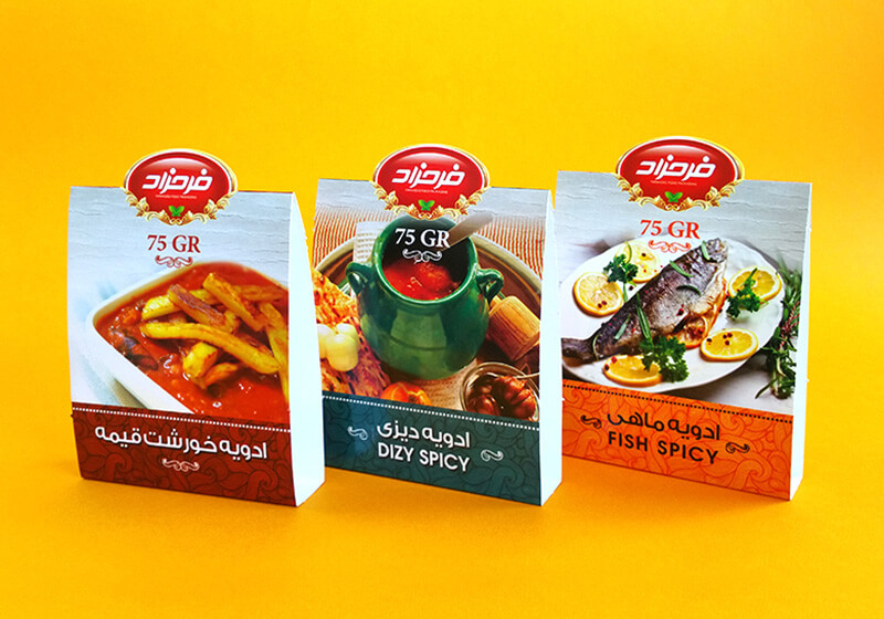 طراحی بسته بندی انواع ادویه فرحزاد، طبق نظر مشاوران طراحی گرافیک عرفان و با مشورت با برند فرحزاد بصورت پاکتی و در وزن های مختلف صورت گرفته است.