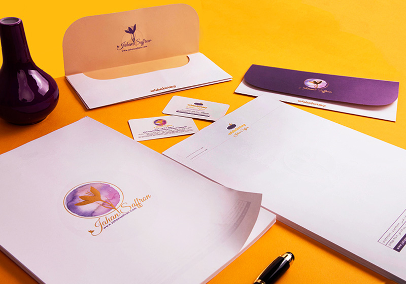 در طراحی اوراق اداری شرکت جهان زعفران از عنصر گل زعفران و رنگ بنفش استفاده شده است.