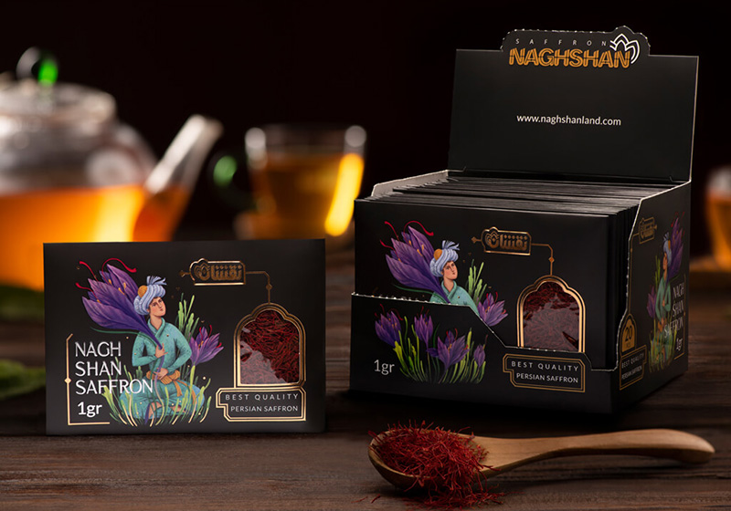 طراحی بسته بندی زعفران پاکتی نقشان به سفارش و تاکید این برند بر نمایش اصالت و کیفیت زعفران ایرانی توسط تیم طراحی و تصویرسازی گروه طراحان عرفان صورت گرفته است.