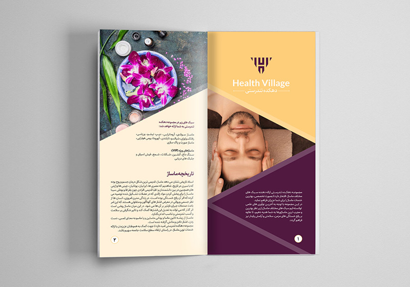 طراحی کاتالوگ یکی از رسانه های مکتوب و تاثیر گذار در تبلیغات یک برند می باشد که اگر حرفه ای طراحی و اجراء گردد می تواند در نقش یک بازاریاب حرفه ای برای آن برند عمل کند. با توجه به خدمات متنوع دهکده تندرستی و همچنین مخاطبان جوان و پر انرژی آن اول از همه قطع کاتالوگ به صورت پالتویی و جمع و جور در نظر گرفته شد که هم دست و پاگیر نباشد برای مخاطب و هم اینکه راحت قابل حمل و قابل مطالعه باشد و در عین حال با توجه به افزایش نرخ کاغذ و خدمات چاپ از نظر اقتصادی مقرون به صرفه باشد. خدمات دهکده تندرستی بیشتر انواع ماساژ می باشد که توسط افراد تحصیل کرده و همچنین آموزش دیده و با تجربه انجام می گردد. استفاده از تصاویر مرتبط با خدمات این برند در طراحی کاتالوگ بسیار حائز اهمیت است. یک کاتالوگ حرفه ای و با کیفیت برای محصولات و خدمات یک برند می تواند در فروش آن برند تاثیر مستقیم داشته باشد.